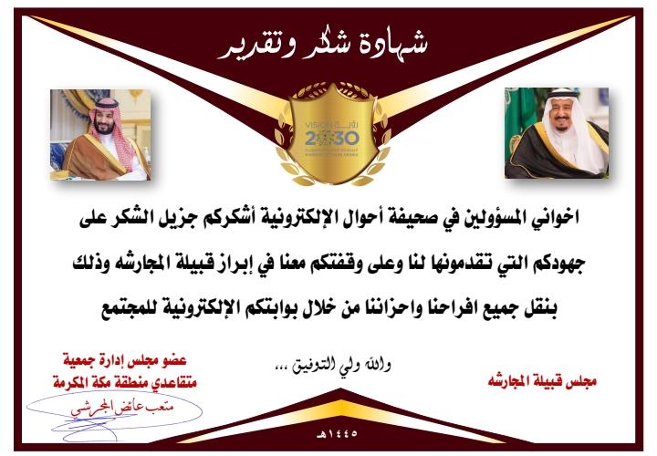 واعرب عضو مجلس القبيلة وعضو مجلس إدارة جمعية متقاعدي منطقة مكة المكرمة الأستاذ متعب عائض المجرشي عن بالغ الشكر والتقدير لمنسوبي الصحيفة على هذه الجهود
