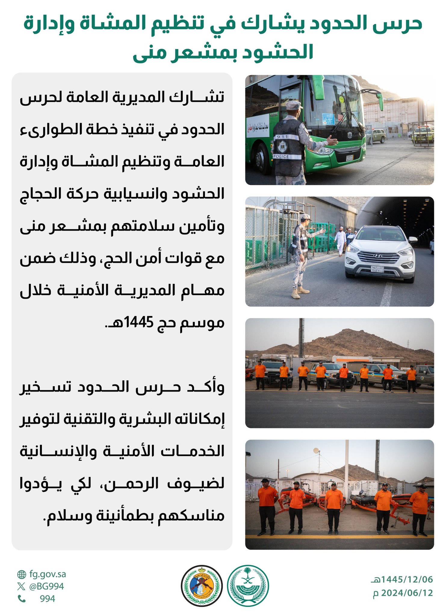 تشارك المديرية العامة لحرس الحدود في تنفيذ خطة الطوارىء العامة وتنظيم المشاة وإدارة الحشود وانسيابية حركة الحجاج وتأمين سلامتهم بمشعر منى مع قوات أمن الحج، وذلك ضمن مهام المديرية الأمنية خلال موسم حج 1445هـ.
