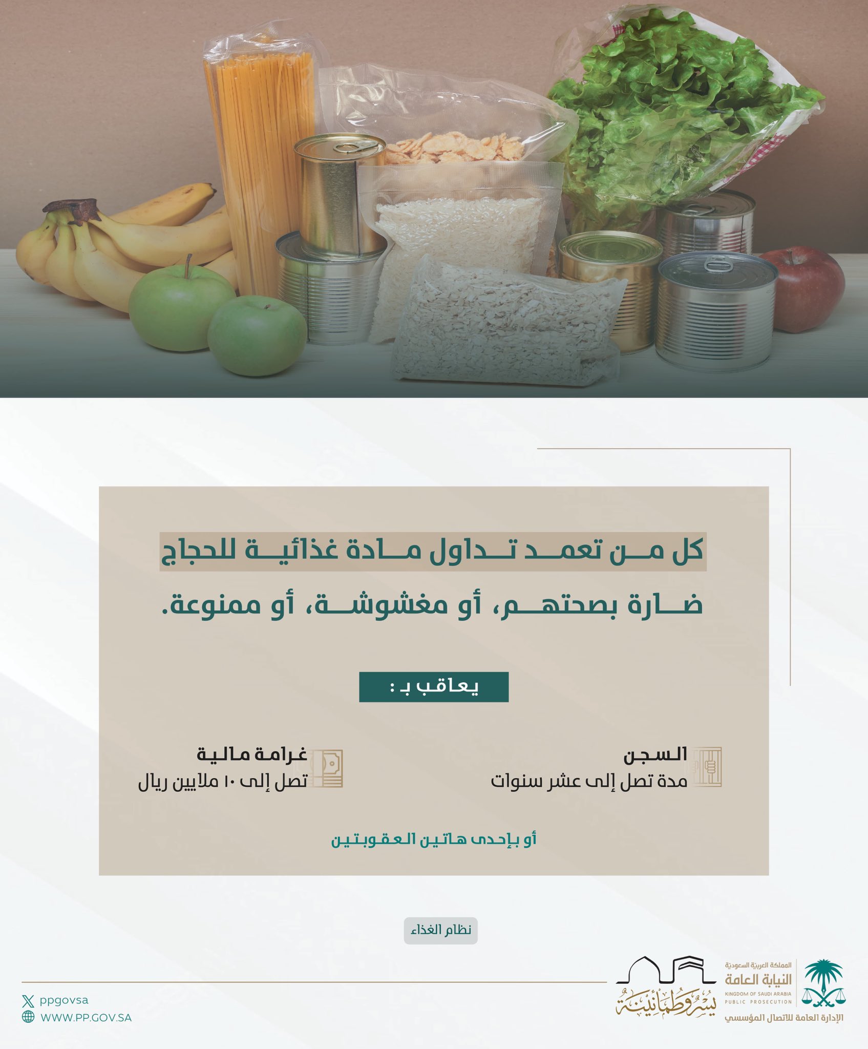 في منشور بموقع النيابة العامة على الشبكة العنكبوتية “إكس” @ ppgovsa ما يؤكد أن التغذية المخصصة للحجاج تحظى بحماية جنائية رفيعة تجاه أي تعمد بتداول مواد غذائية ضارة بالصحة أو مغشوشة أو ممنوعة، وقرر نظام الغذاء عقوبات مشددة حال ارتكاب أي من ذلك:
