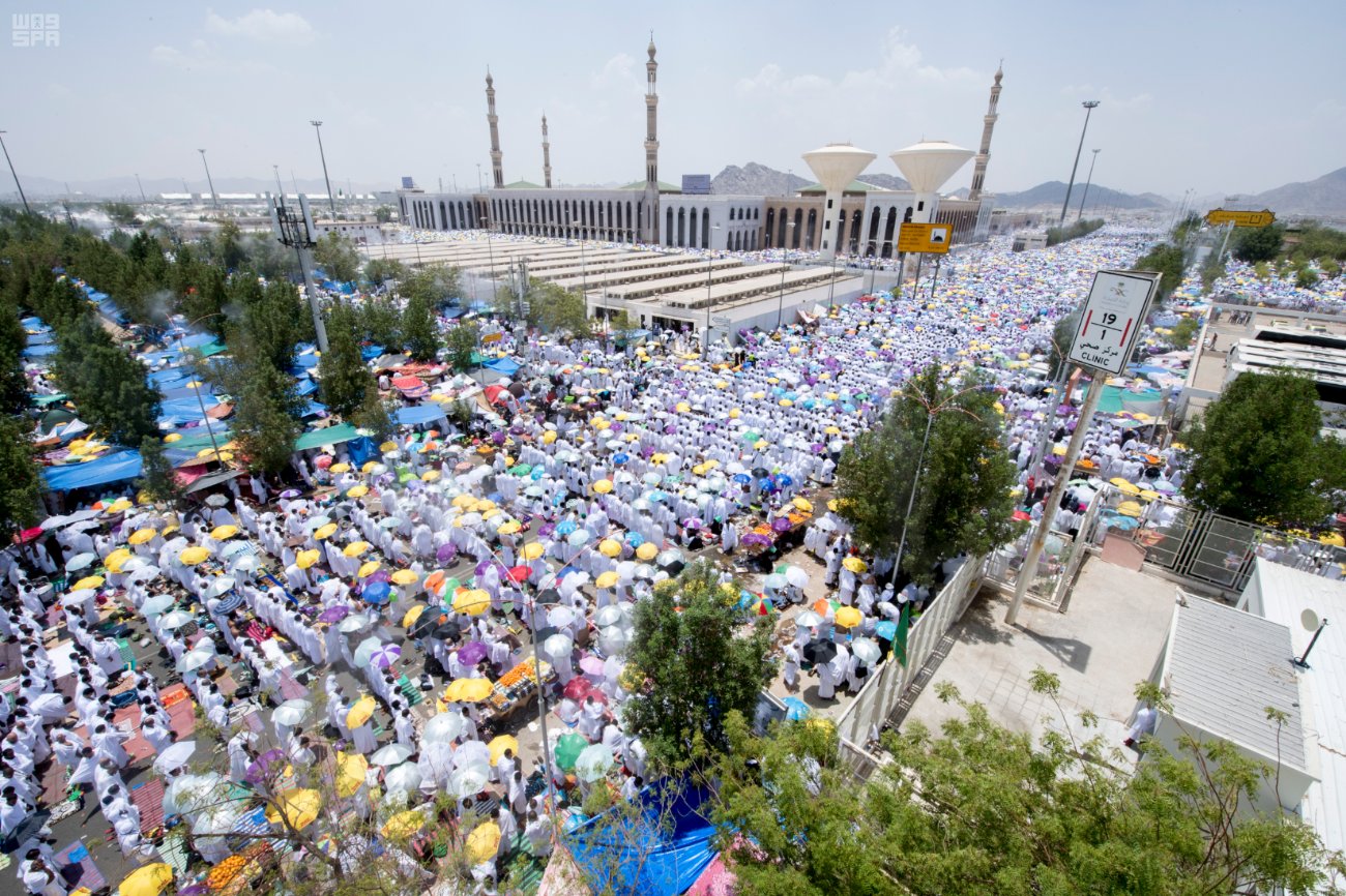 توافد حجاج بيت الله الحرام منذ وقت مبكر إلى مسجد نمرة في مشعر عرفات اليوم للاستماع إلى خطبة عرفة، وأداء صلاتي الظهر والعصر جمعاً وقصراً؛ اقتداءً بسنة النبي المصطفى محمد صلى الله عليه وسلم.
