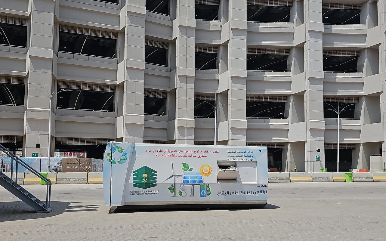 وفرت الإدارة العامة للنظافة بأمانة العاصمة المقدسة بوكالة الخدمات صناديق لجمع النفايات تعمل بالطاقة النظيفة [الطاقة الشمسية] صديقة للبيئة لا تحتاج توصيلات كهربائية والتي يصعب توفير مصدر تيار كهربائي لها لما له من مخاطر عند توافد الحجيج والازدحام خلال موسم الحج.