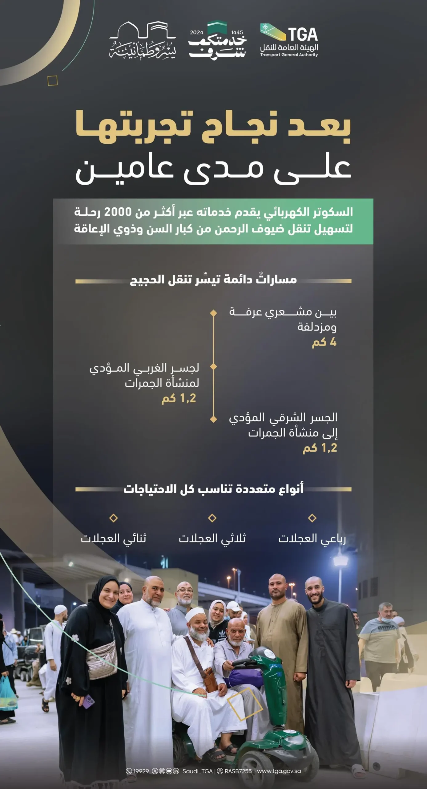 أعلنت الهيئة العامة للنقل عن أكثر من 2000 رحلة تمت عبر مبادرة السكوتر الكهربائي، مشيرةً إلى أنها أثبتت نجاحها على مدى عامين من التجربة، لتنطلق هذا العام كخدمة رئيسة؛ تهدف إلى تيسير حركة حجاج بيت الله الحرام من كبار السن وذوي الإعاقة.