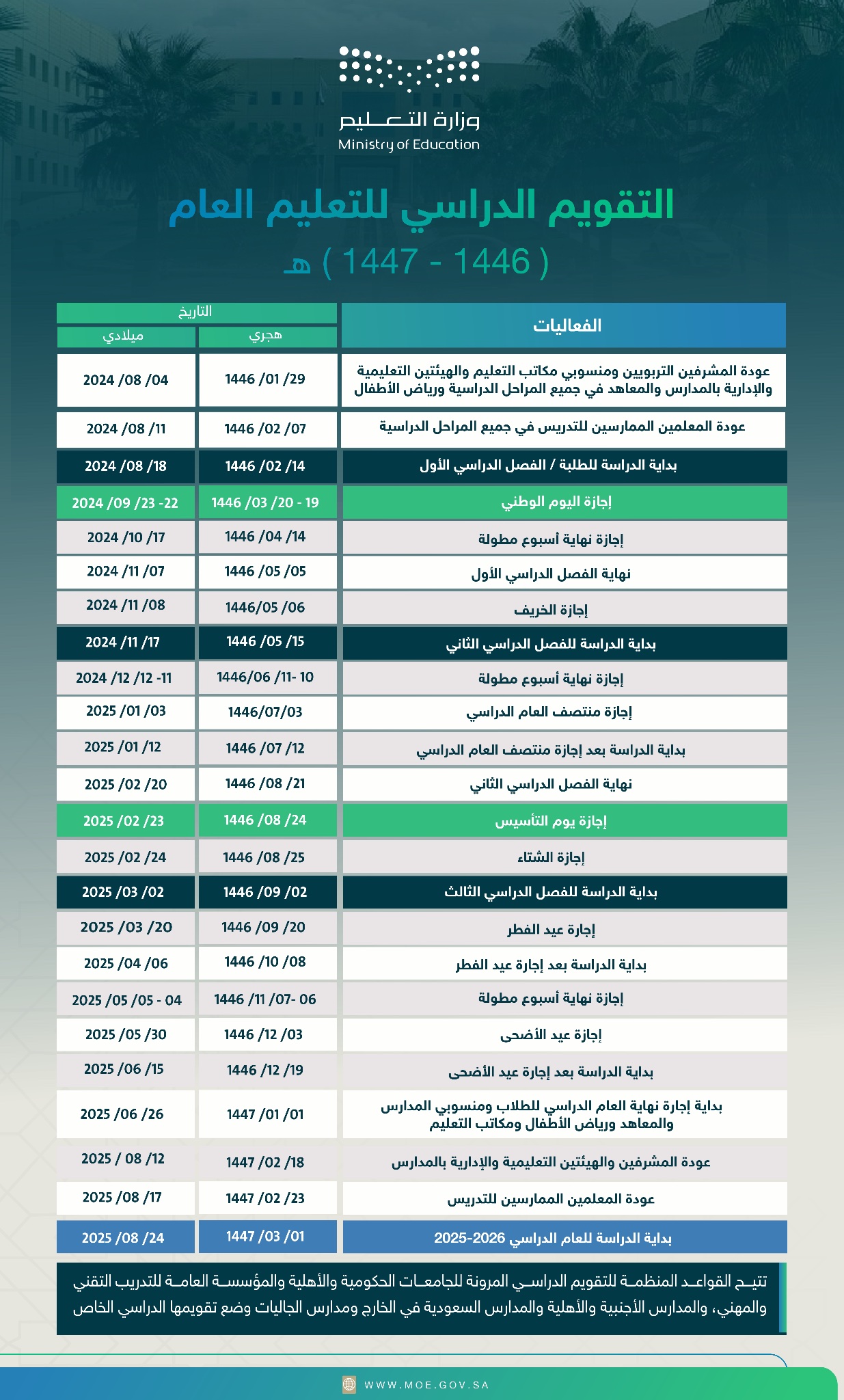 التقويم الدراسي للتعليم لعام (1446-1447)هـ