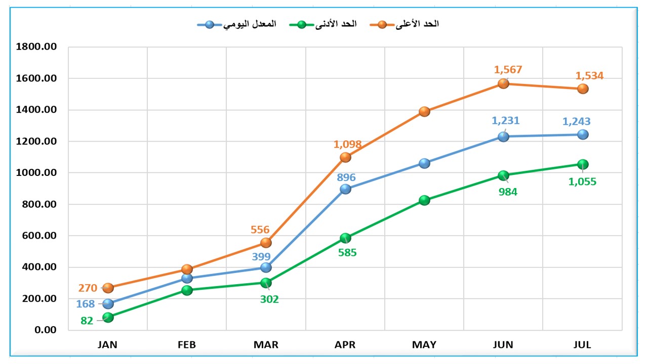 الشكل (6) يوضح أهم مؤشرات عام 2020 وسبعة أشهر من عام 2021، وعند مقارنة مؤشرات الحالات اليومية كمعدل والحد الأعلى والأدنى للحالات المسجلة، في شهر جون من عام 2020، بالمؤشرات في الثلاثة أشهر الأخيرة من عام 2020 والأشهر السبعة الأولى من عام 2021 قد يوحي ذلك بزوال خطر انتشار كوفيد-19 من خلال الإحصائيات الخاصة بالمعدل اليومي للحالات الجديدة New cases ، إلا ان ذلك الشعور قد يتلاشى عند تحليل مؤشرات عام 2021 فقط والتي تؤكد ضرورة زيادة الحرص في الأخذ بالاحترازات الصحية عند التنقل او المشاركة بالفعاليات التي تستدعي التجمع وتفعيل تطبيق توكلنا للحد من الانتشار لا سمح الله.