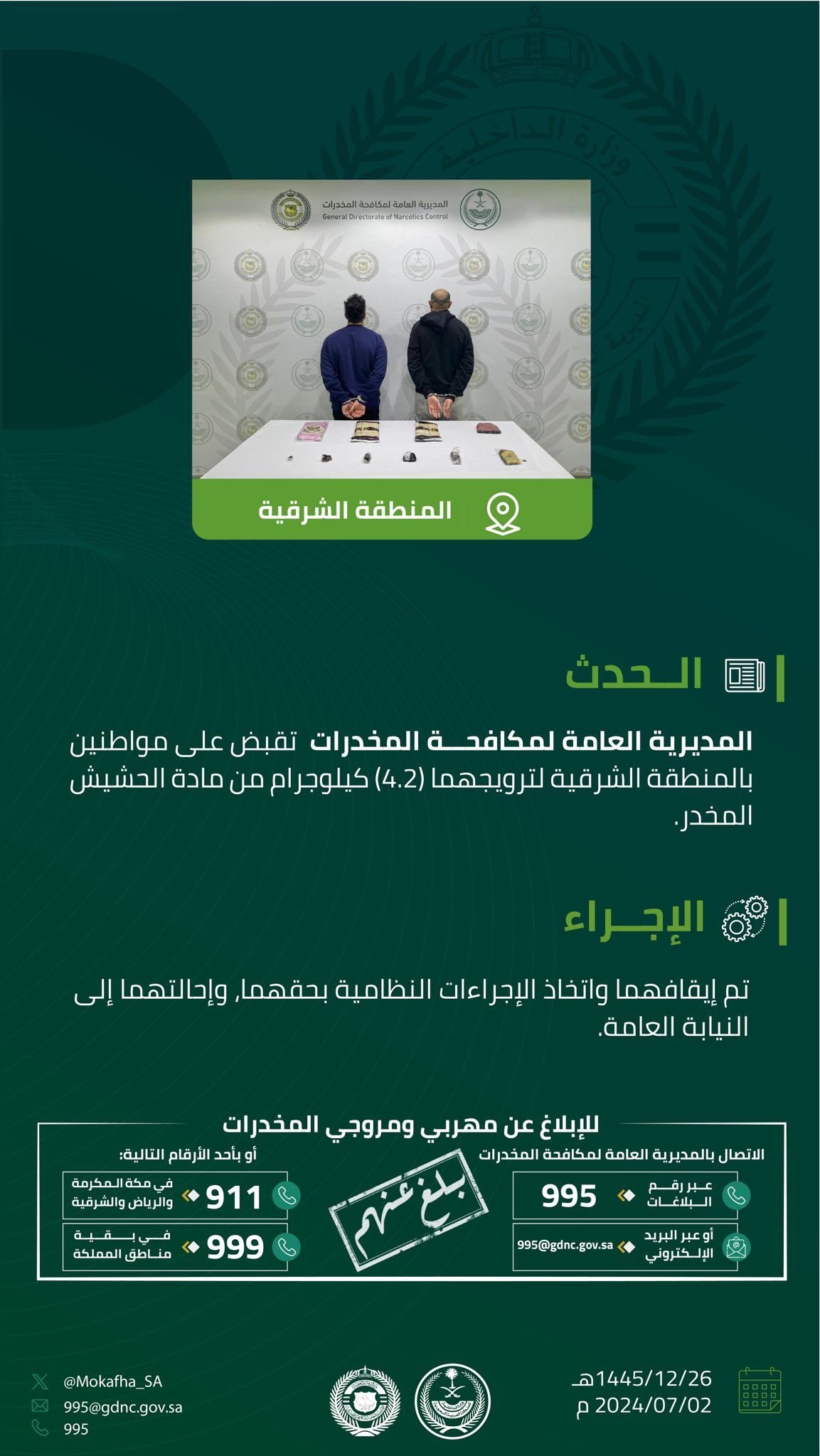 طالعنا موقع مكافحة المخدرات على الشبكة العنكبوتية “أكس” @Mokafha_SA بان رجاله نمكنزا بفضل من الله ثم بماوفر لهم من امكانيات فنية من القبض على مواطنين بالمنطقة الشرقية لترويجهما (4.2) كيلوجرام من مادة الحشيش المخدر.