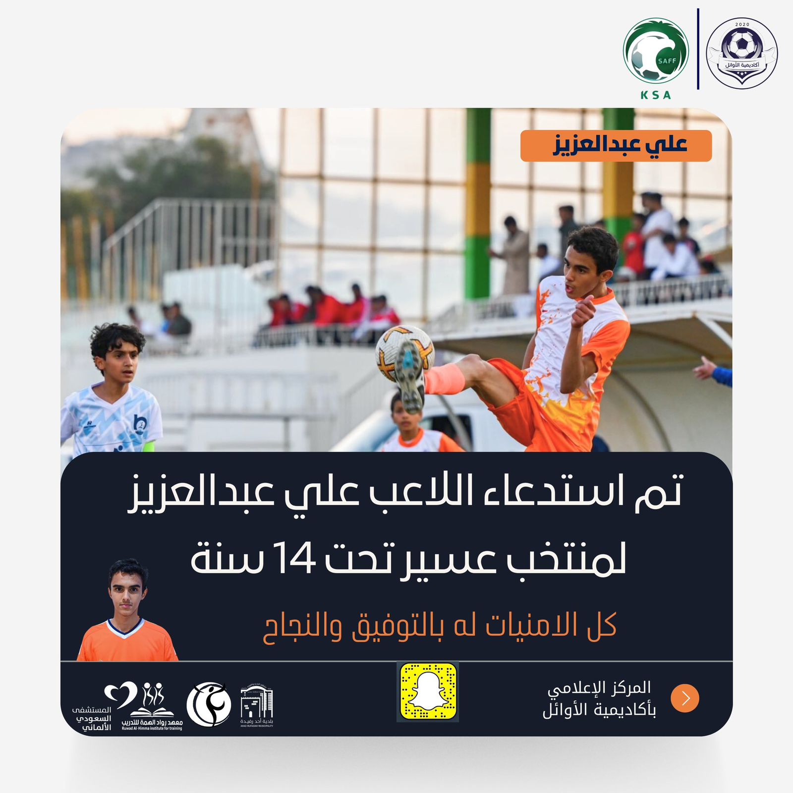 تم استدعاء اللاعب الواعد علي عبدالعزيز لمنتخب عسير الإقليمي تحت ١٤ سنه وذلك لخوض منافسات بطولة المملكة لمنتخبات المناطق تحت 14/ 13 سنة المقامه في منطقة الطائف