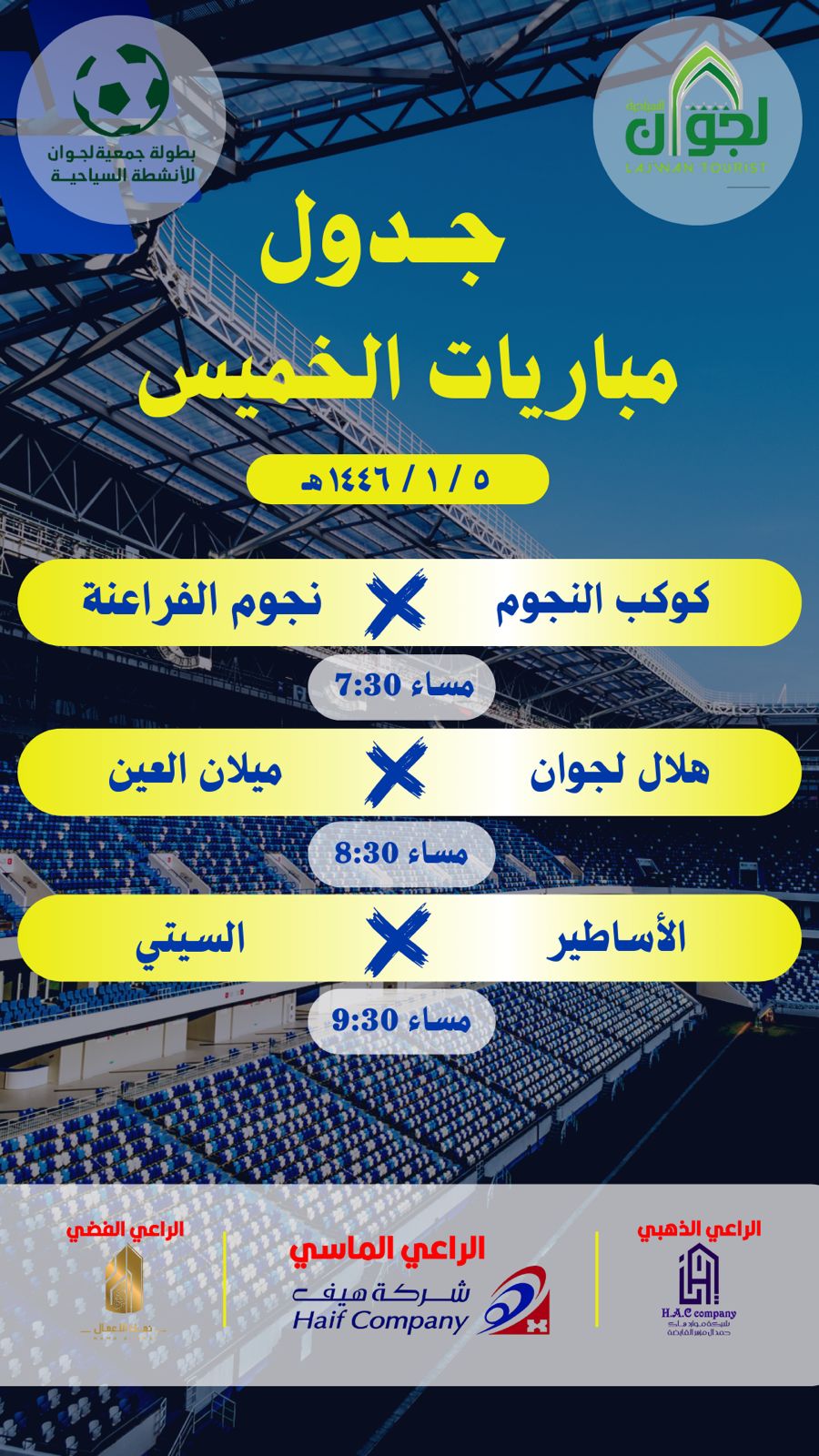 تنطلق اليوم الخميس الجولة الثانية من بطولة جمعية لجوان التعاونية للانشطه السياحية المقامة في محافظة أحد رفيده بثلاث مواجهات ويلتقي في المباراه الأولى كوكب الجنوب ونجوم الفراعنة.
