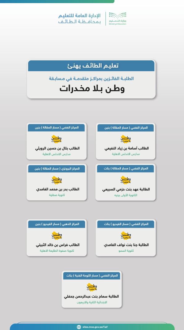 تعليم الطائف يهنيء الطلبة الفائزين بمراكز متقدمة في مسابقة وطن بلا مخدرات