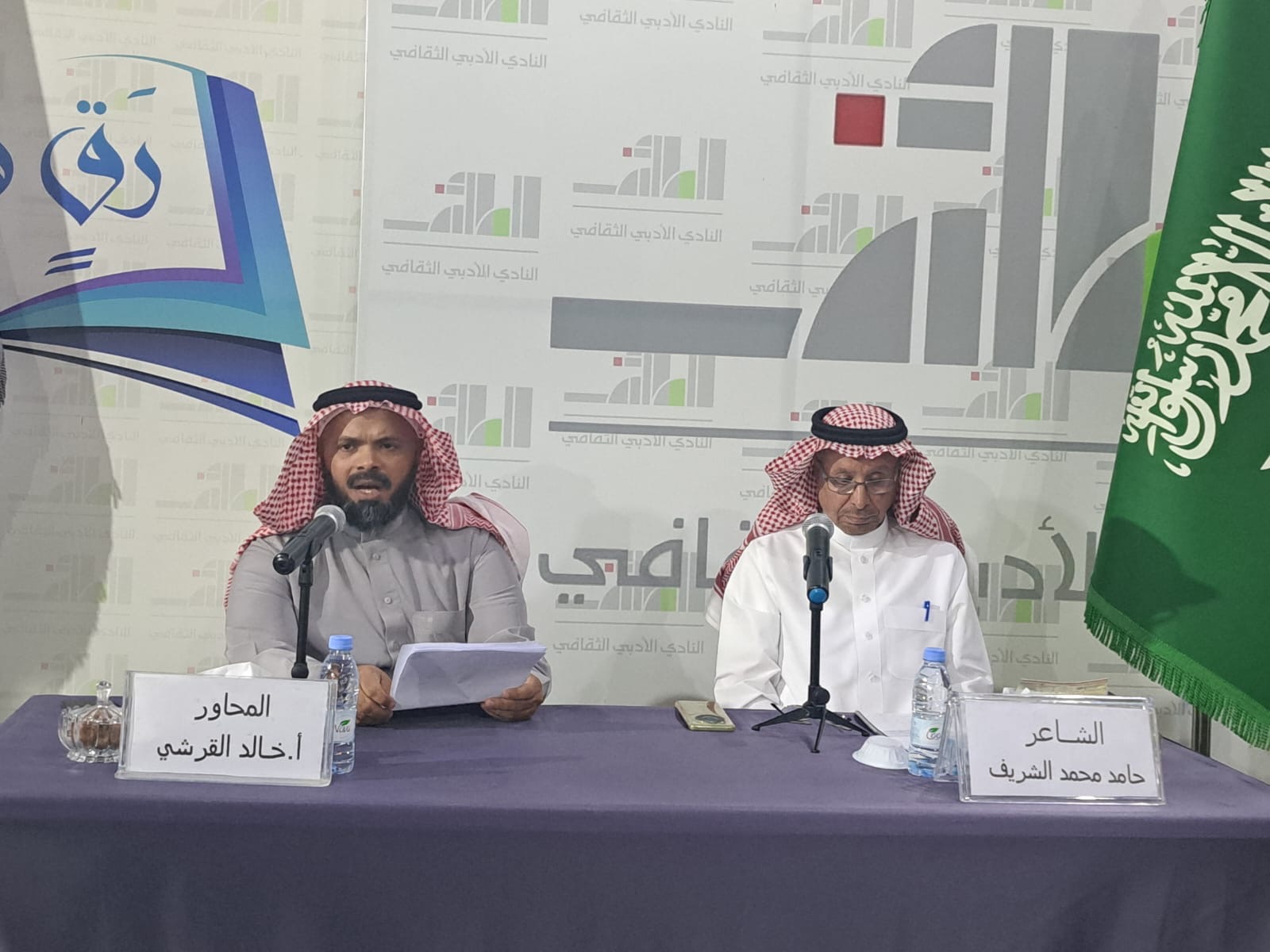 وقد أدار الأستاذ خالد القرشي اللقاء عبر محاور عديدة تنقل فيها بين نشأة الشريف بالطائف وتجربته الشعرية وانتقاله إلى الرياض مستعرضا عددا من القصائد الشعرية في الديوان .