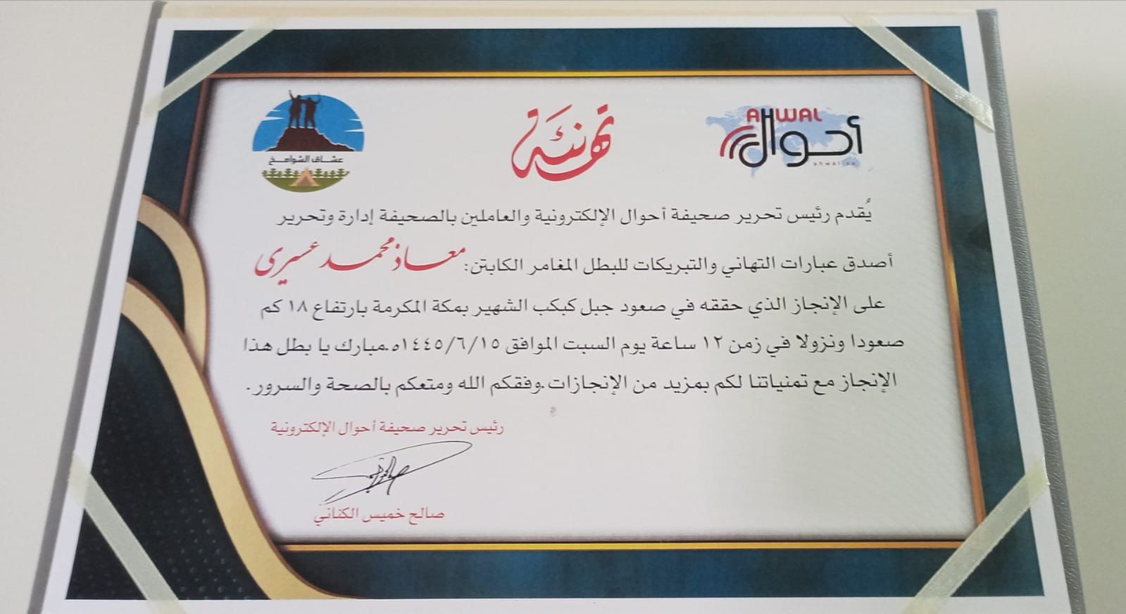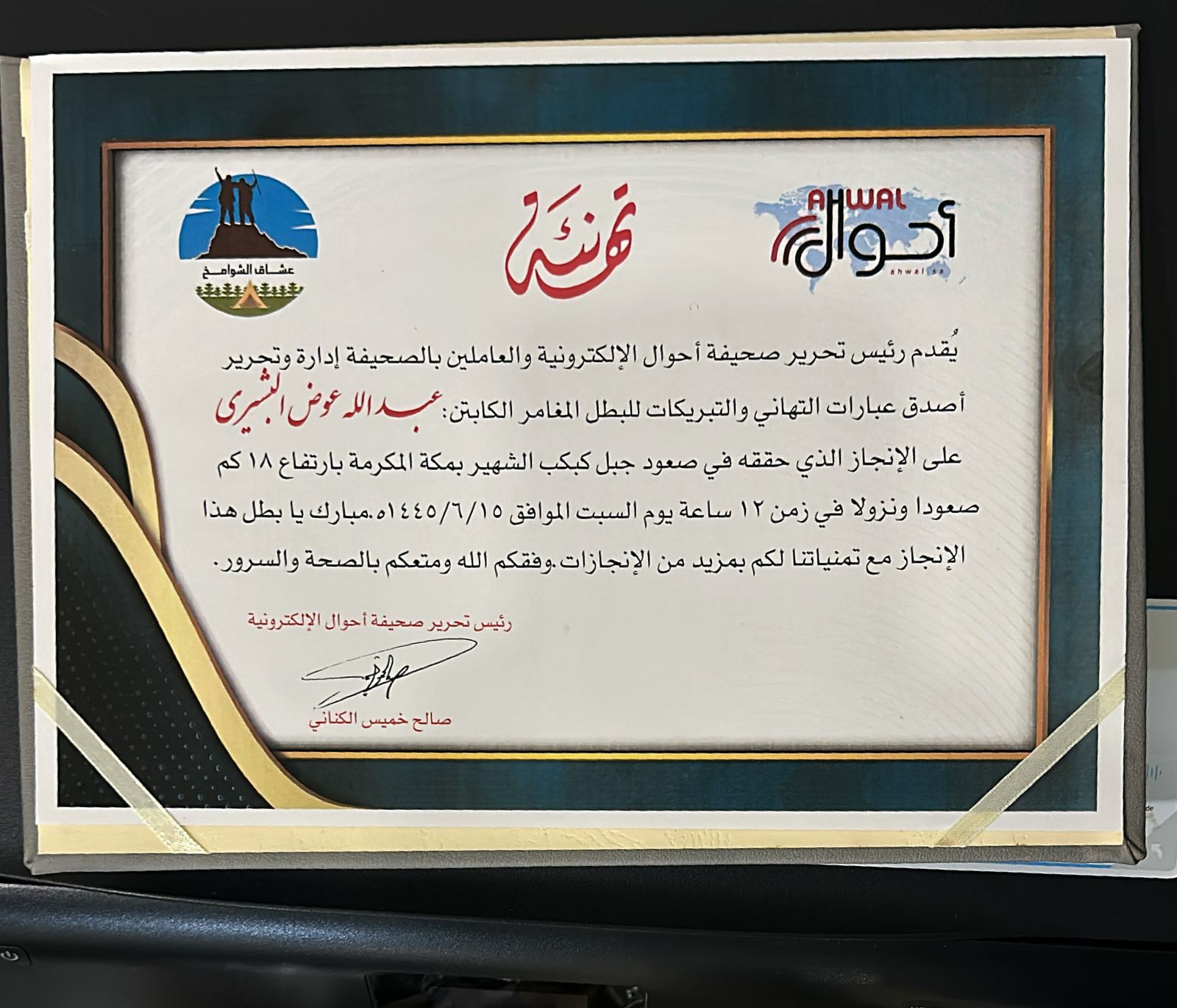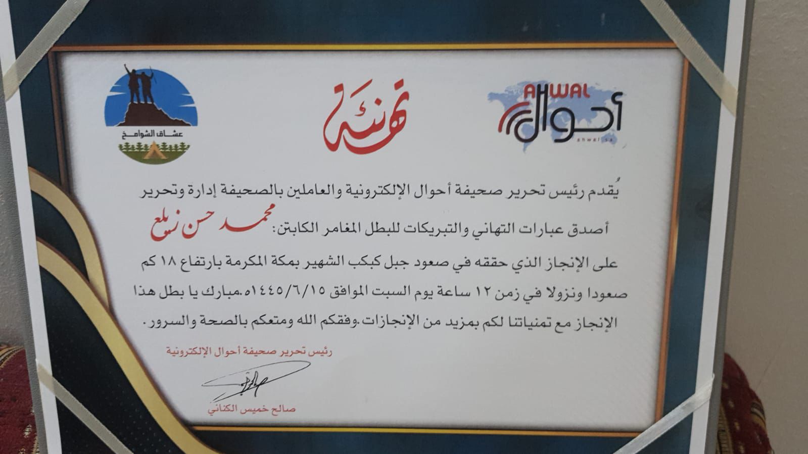أبطال فريق هايكنج شوامخ مكة يتقدمون بالشكر والتقدير والاحترام إلى رئيس تحرير صحيفة احوال الإلكترونية على هذه البادرة الجميلة والتكريم الذي جعلوه وسام فخر على صدورهم وتأج عز على رؤوسهم. ووعدو الأستاذ صالح بالمزيد من الإنجازات بإذن الله تعالى.