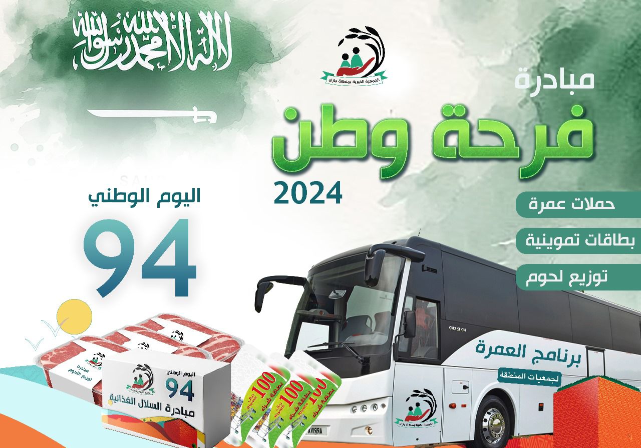تزامناً مع ذكرى المملكة ليومها الوطني ” 94 ” تطلق جمعية البر الخيرية بجازان مبادرة فرحة وطن العام “2024م” وذلك بعمل برامج منها 20 باص للعمرة وتوزيع 15 الف سلة غذائية و 2000 كيلوا من اللحوم الطازجة و500 بطاقة تموينية