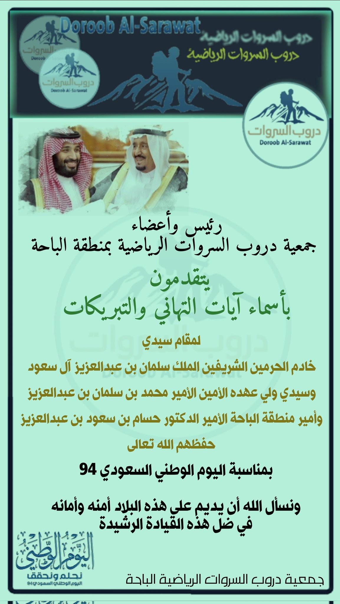 رفع رئيس وأعضاء جمعية دروب السروات الرياضية بمنطقة الباحة أسمى أيات التهاني والتبريكات الى مقام خادم الحرمين الشريفين الملك سلمان بن عبد العزيز وسمو ولي العهد رئيس مجلس الوزراء الأمير محمد بن سلمان وسمو امير منطقة الباحة الأمير الدكتور حسام بن سعودباليوم الوطني السعودي ٩٤.