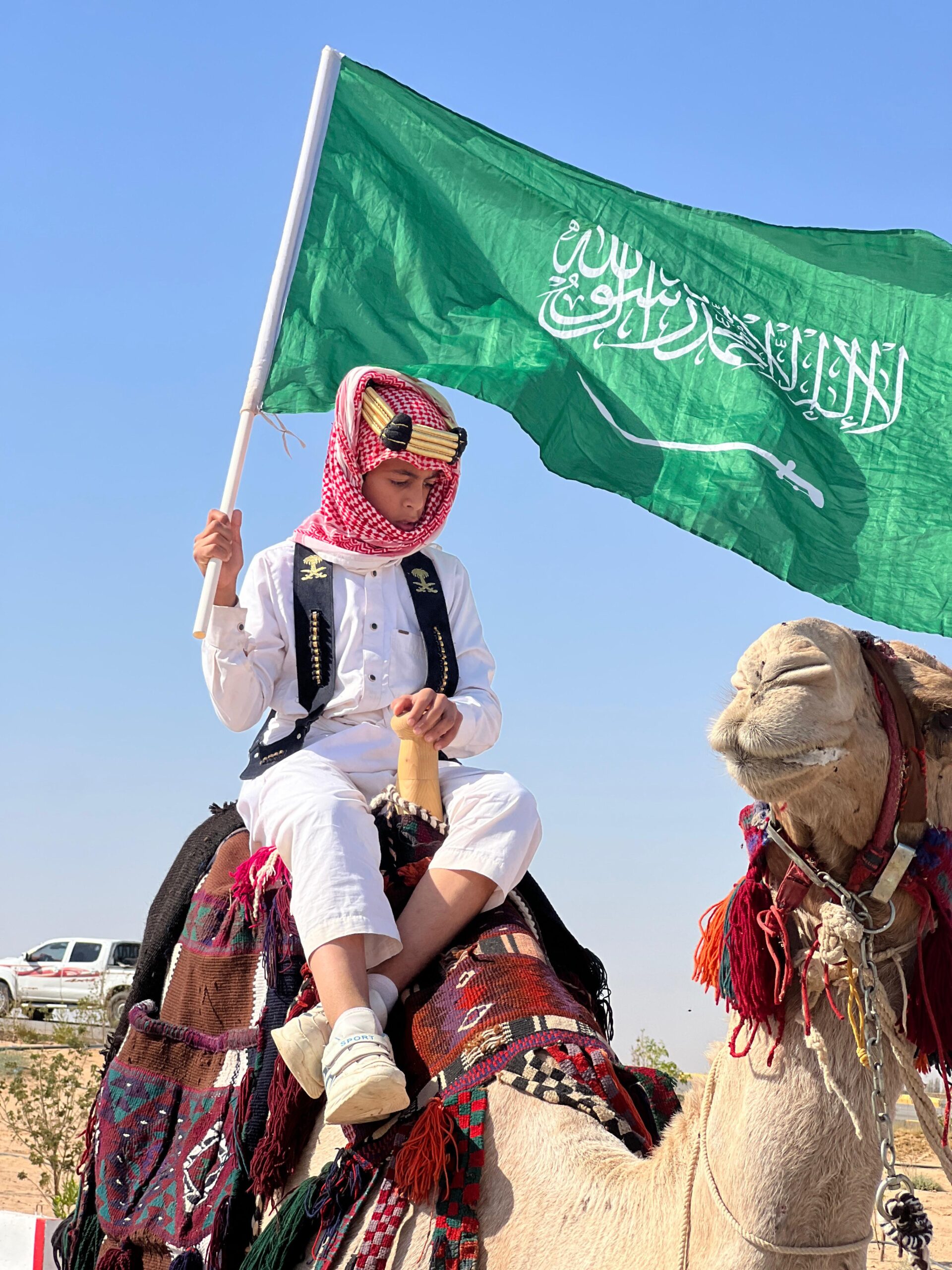 بعد ذلك بدأت المسيرة التي شارك فيها عددٍ من طلاب المدارس في قرية شيبة والنباح مع الهجانة من ” حرائر الإبل ” المزينة يحملون راية التوحيد وتحكي قصة تطور العلم السعودي .