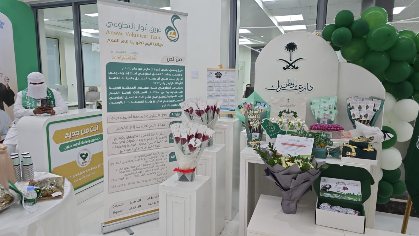 ثم انطلق الفريق بتجهيز ركن ضيافة وأعلام وورد لاستقبال زوار المستشفى ثم انطلق الفريق لزيارة المرضى ثم زيارة أقسام المستشفى ومعايدتهم وتوزيع الورود والهدايا وشاركوهم فرحتهم بالاحتفاء باليوم الوطني ٩٤ .