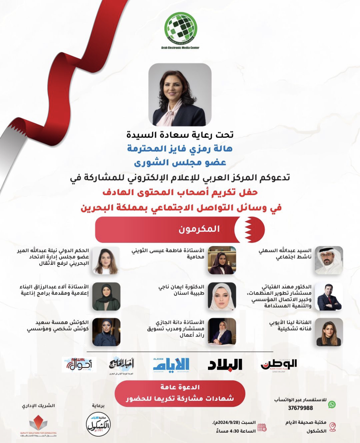 وقد اختتم الحفل بتقديم جائزة فارس شباب الإعلام البحريني ٢٠٢٤ من قبل المركز العربي للإعلام الإلكتروني بمملكة البحرين إلى سعادة السيدة هالة رمزي عضو مجلس الشورى تقديرا لجهودها في دعم الكفاءات الوطنية المميزة و المؤثرة في المجتمع .