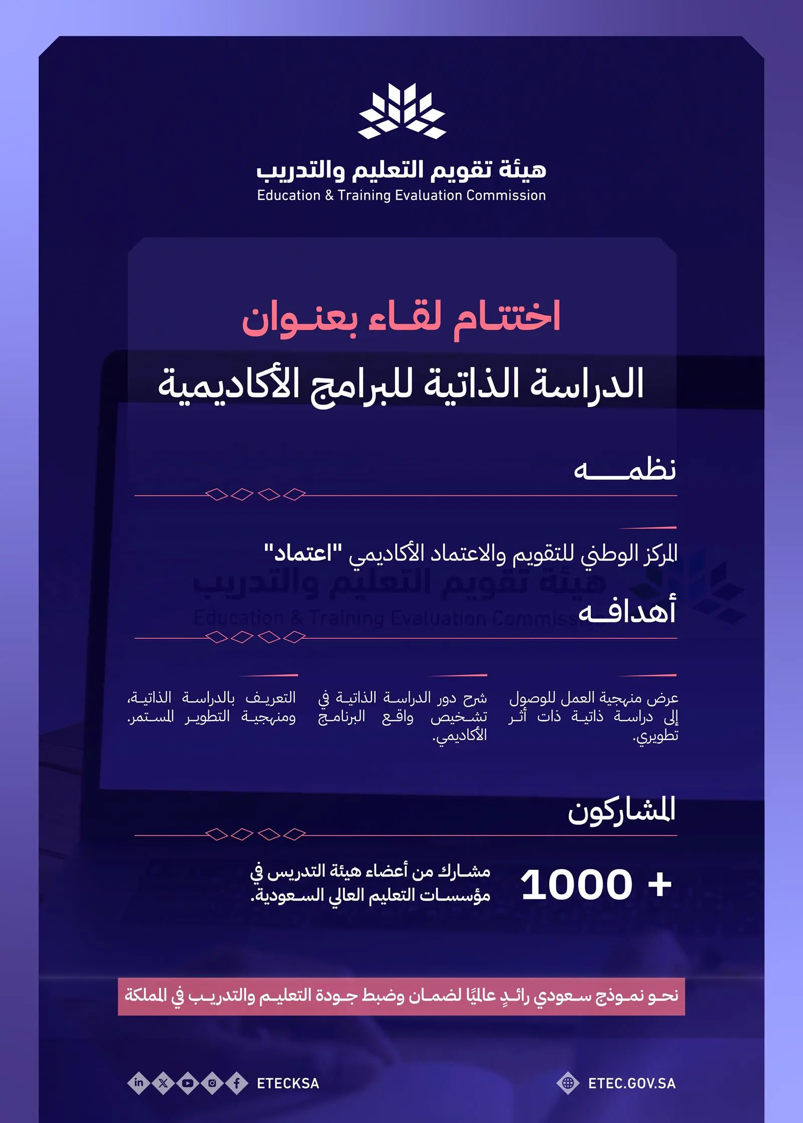 اختتمت هيئة تقويم التعليم والتدريب، ممثلة بالمركز الوطني للتقويم والاعتماد الأكاديمي “اعتماد”, لقاءً بعنوان “الدراسة الذاتية للبرامج الأكاديمية”, بحضور ما يقارب 1000 مشارك من أعضاء هيئة التدريس بمؤسسات التعليم العالي.