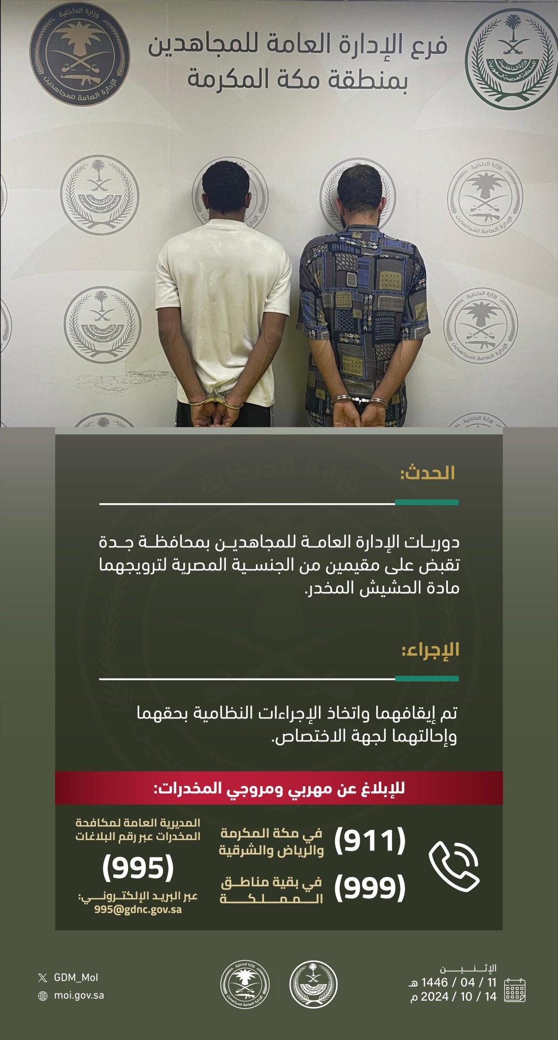 قبضت دوريات الإدارة العامة للمجاهدين بمحافظة جدة على مقيمين من الجنسية المصرية لترويجهما مادة الحشيش المخدر، وجرى إيقافهما واتخاذ الإجراءات النظامية بحقهما، وإحالتهما إلى جهة الاختصاص.