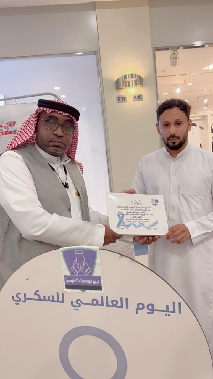 نضم فريق قوة عطاء التطوعي التابع لجمعية رواد العمل التطوعي مبادرة “خليك صحي “ وذلك بالشراكه مع فريق الوعي الصحي بمجمع الراشد مول بجازان التي تهدف إلى التوعية بمرض السكري ورفع مستوى الوعي حول تأثير داء السكري بالمجتمع بحضور نائب الفريق أ. عطيف سفياني والمدير التنفيذي لجمعية التوعية والتأهيل الاجتماعي بجازان د . هادي بحاري. وحضور قائد فريق الوعي الصحي أ.حسين شبيلي ومديرة إدارة التطوع الصحي أ . رحمه بهكلي وعدد من الجهات المشاركة وعدد من الضيوف .
