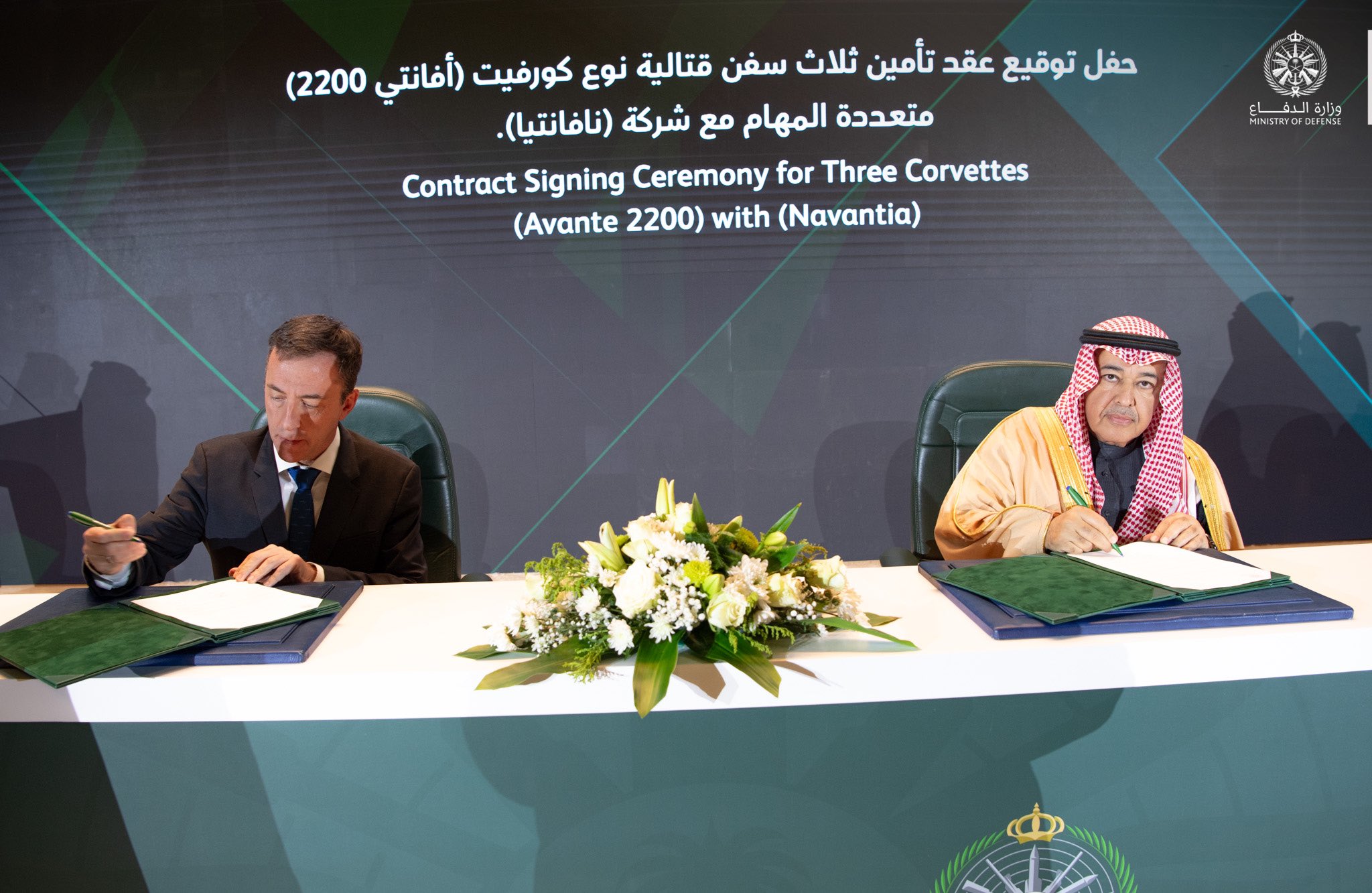 وقَّعت وزارة الدفاع في الرياض، اليوم، عقدًا مع شركة نافانتيا الإسبانية للاستحواذ وتوريد ثلاث سفن قتالية متعددة المهام من طراز «كورفيت أفانتي 2200»، لصالح القوات البحرية الملكية السعودية، بحضور معالي رئيس هيئة الأركان العامة الفريق الأول الركن فياض بن حامد الرويلي.