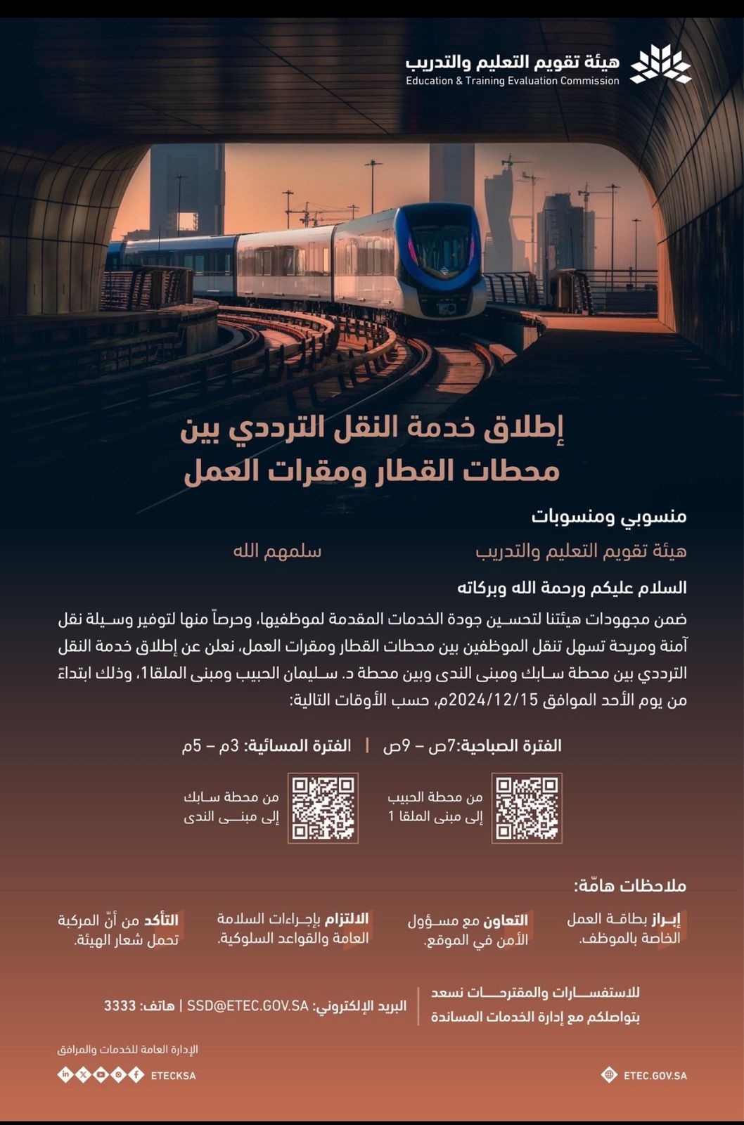 الهيئة تطلق خدمة النقل الترددي لموظفيها بين محطات القطار ومقرات عملها بدءاً من تاريخ اليوم. وتهدف المبادرة لتسهيل تنقل موظفيها بكل يسر وسهولة.