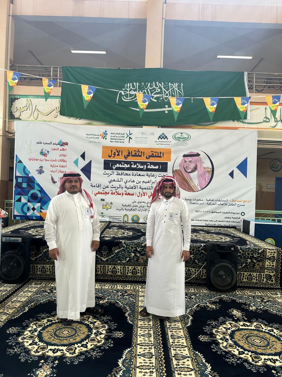 شاركت إدارة المساجد والدعوة والإرشاد بمحافظة الريث في الملتقى الثقافي الأول ( صحة وسلامة مجتمعي ) الذي نظمته جمعية التنمية الأهلية بالمحافظة بحضور ورعاية سعادة المحافظ الاستاذ إبراهيم بن هادي الشعبي .