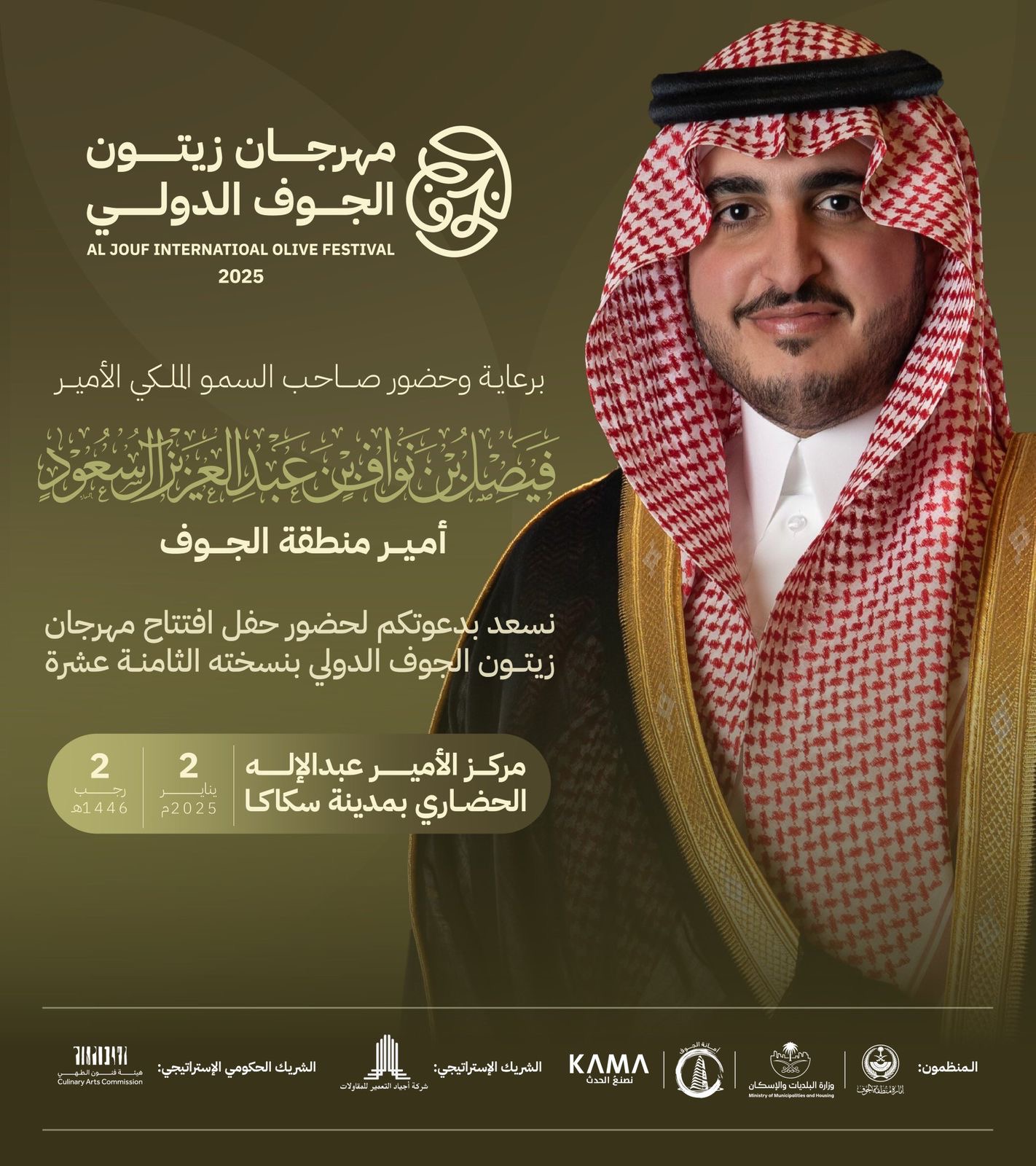 يدشن صاحب السمو الملكي الأمير فيصل بن نواف بن عبد العزيز أمير منطقة الجوف بعد غد, فعاليات مهرجان زيتون الجوف الدولي في نسخته الثامنة عشرة، بمركز الأمير عبدالإله الحضاري بمدينة سكاكا.