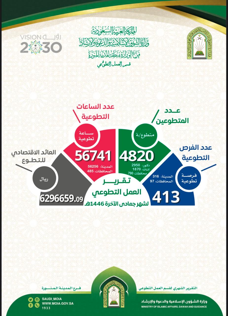 حيث نفذ الفرع خلال الشهر الماضي (جمادى الآخرة) 413 فرصة تطوعية منها 316 فرصة بالمدينة المنورة و97 فرصة بالمحافظات التابعة لها، شارك فيها 4820 من الرجال والنساء، مسجلي بذلك 56741 ساعة تطوعية