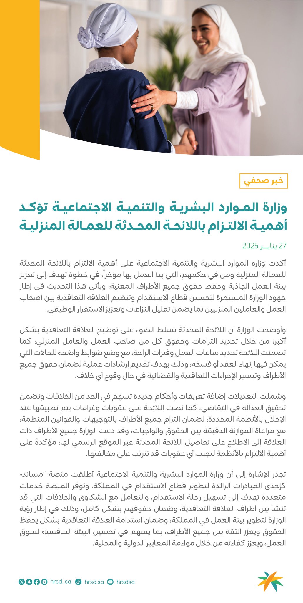 أكّدت وزارة الموارد البشرية والتنمية الاجتماعية على أهمية الالتزام باللائحة المحدثة للعمالة المنزلية ومن في حكمهم، التي بدأ العمل بها مؤخرًا، في خطوة تهدف إلى تعزيز بيئة العمل الجاذبة وحفظ حقوق جميع الأطراف المعنية.