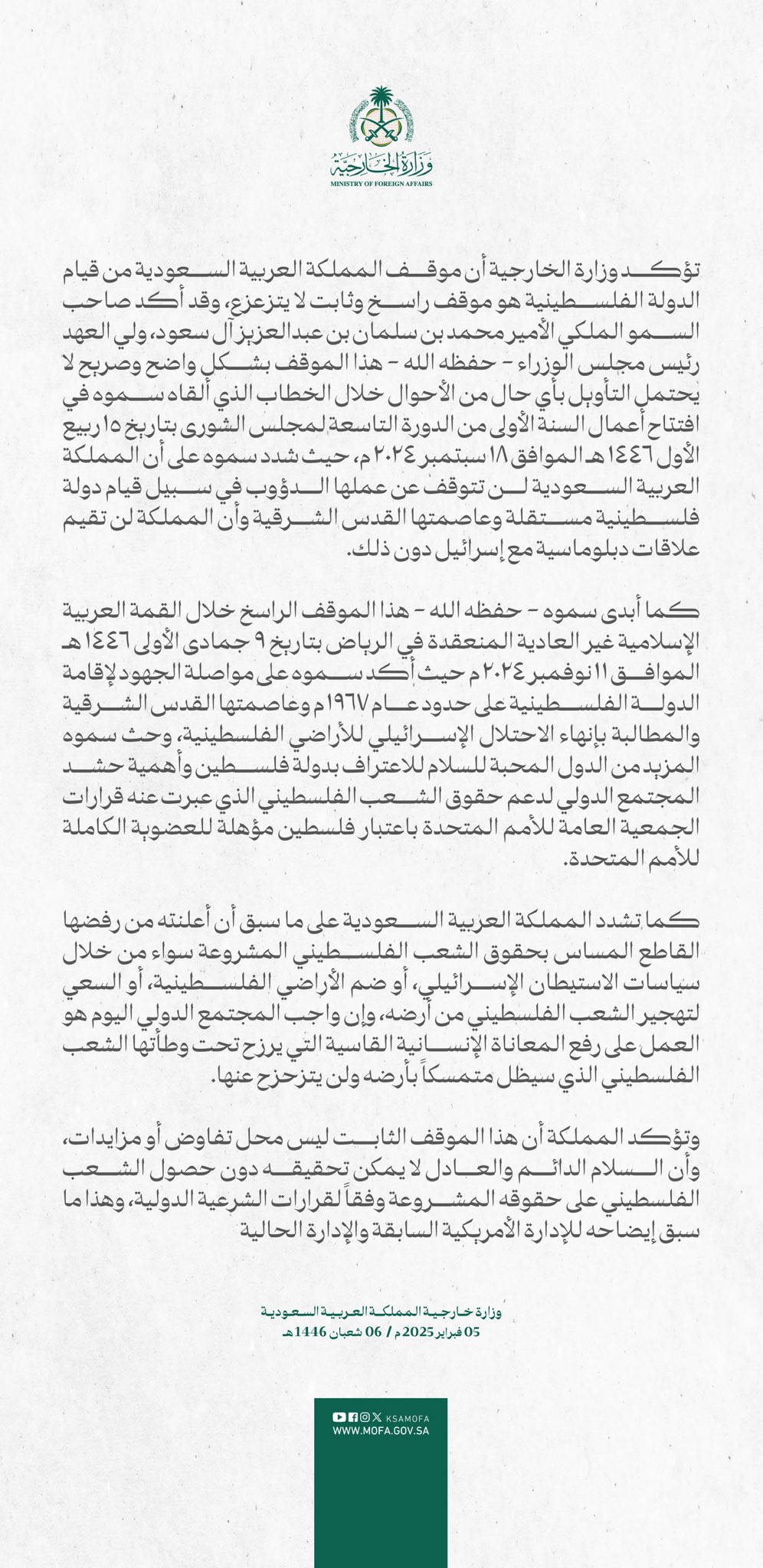 تأكيد المملكة العربية السعودية في جميع المناسبات على أقامة الدولة الفلسطينية معروف وثابت وكثيرا ما نجد وزارة الخارجية @KSAMOFA توضح هذا الامر عبر ماتصدر من بيانات أخرها البيان التالي الذي تؤكد من خلاله وزارة الخارجية أن موقف المملكة العربية السعودية من قيام الدولة الفلسطينية هو موقف راسخ وثابت لا يتزعزع، وقد أكد سمو #ولي_العهد رئيس مجلس الوزراء – حفظه الله – هذا الموقف بشكل واضح وصريح لا يحتمل التأويل بأي حال من الأحوال.