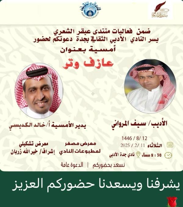 يقيم منتدى عبقر الشعري بالنادي الأدبي بجدة مساء غدا الثلاثاء، 12 /8 /1446 أمسية شعرية بعنوان عازف وتر للشاعر سيف المرواني ويديرالأمسية الشاعر خالدالكديسي نائب رئيس منتدى عبقرالشعري، عند الساعة الثامنة والنصف مساء بقاعة مكتبة النادي كما يصاحب الأمسية معرض مصغر للكتب و معرض تشكيلي من أشراف الاستاذخيرالله زربان.