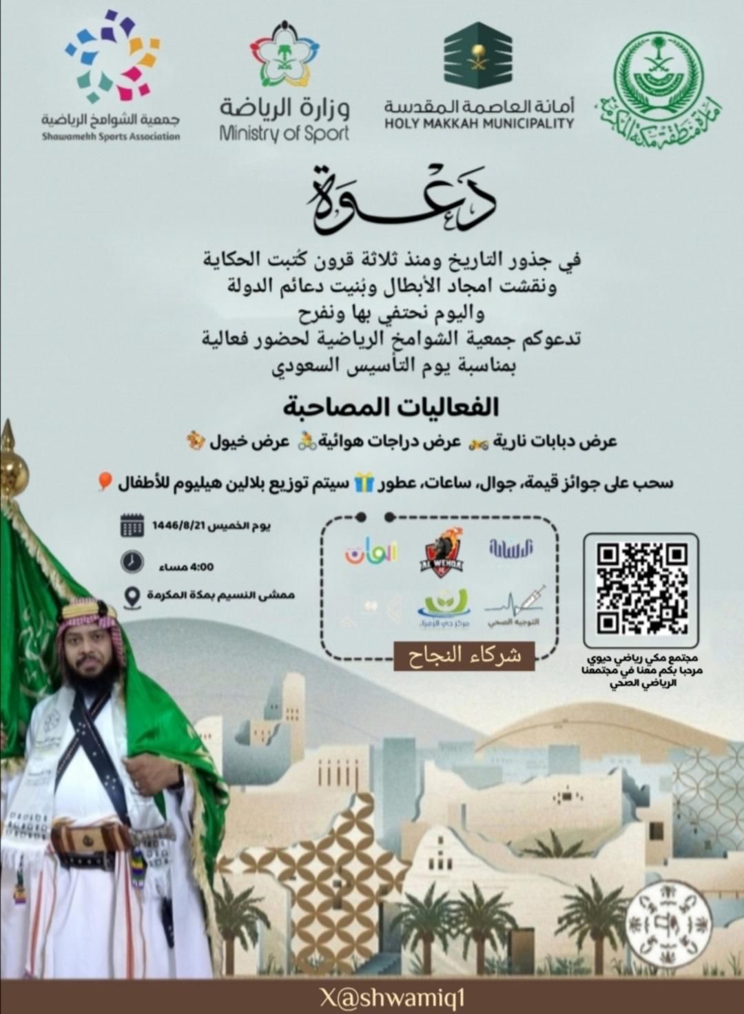 تعتزم جمعية الشوامخ الرياضية بمكة المكرمة بالتعاون مع مكتب وزارة الرياضة بالعاصمة المقدسة وأمانة العاصمة المقدسة بإقامة فعالية في ممشى النسيم الخميس القادم الساعة الرابعة عصراً احتفالاً بيوم التأسيس للمملكة العربية السعودية الذي تشارك فيه عدة قطاعات حكومية وقطاع خاص بالإضافة إلى فرق رياضية وفرق تطوعية حيث الجميع يحتفل بهذا اليوم المجيد الذي يفتخر فيه كل مواطن ومقيم على تراب هذا الوطن الغالي على قلوبنا كيف لا وهو اليوم الذي جمع فيه الملك عبدالعزيز طيب الله ثراه شتاتنا ووحد كلمتنا وأسس فيه دعائم دولتنا الفتية ولذلك دعت جميعة الشوامخ الرياضية المجتمع المكي بالمشاركة كون المناسبة وطنية وتهم الجميع حيث حدد وقت بداية الفعالية الساعة الرابعة عصراً من يوم الخميس ١٤٤٦/٨/٢١هـ