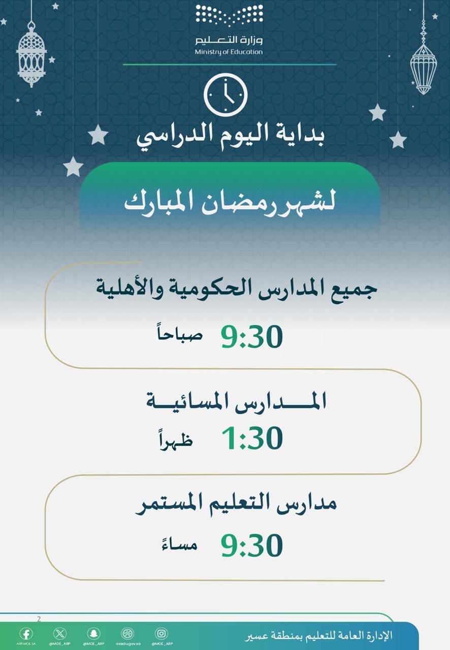 حيث يبدأ التوقيت الزمني لليوم الدراسي خلال ‫شهر رمضان المبارك لعام 1446هـ.