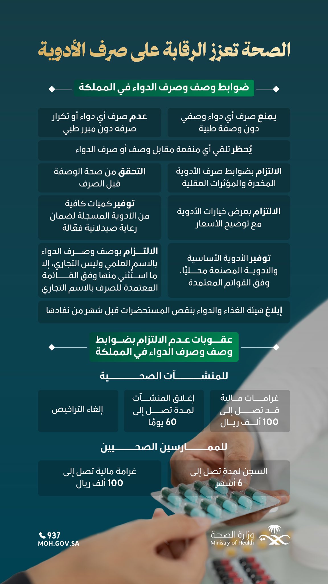 وشددت الوزارة على ضرورة التزام الممارسين الصحيين والمنشآت الصحية بضوابط وصف وصرف الأدوية، ومنها صرف الأدوية بالاسم العلمي فقط، وعرض جميع الخيارات الدوائية المتاحة للمريض، مع توفير الأدوية الأساسية والأدوية المصنعة محليًا وفق القوائم المعتمدة، وضمان صرف الأدوية وفق الضوابط النظامية المعتمدة، بما في ذلك التقيد بالوصفات الطبية وعدم الحصول على أي منفعة غير مشروعة لقاء صرف الدواء، مع الالتزام بضوابط صرف الأدوية المخدرة والمؤثرات العقلية.