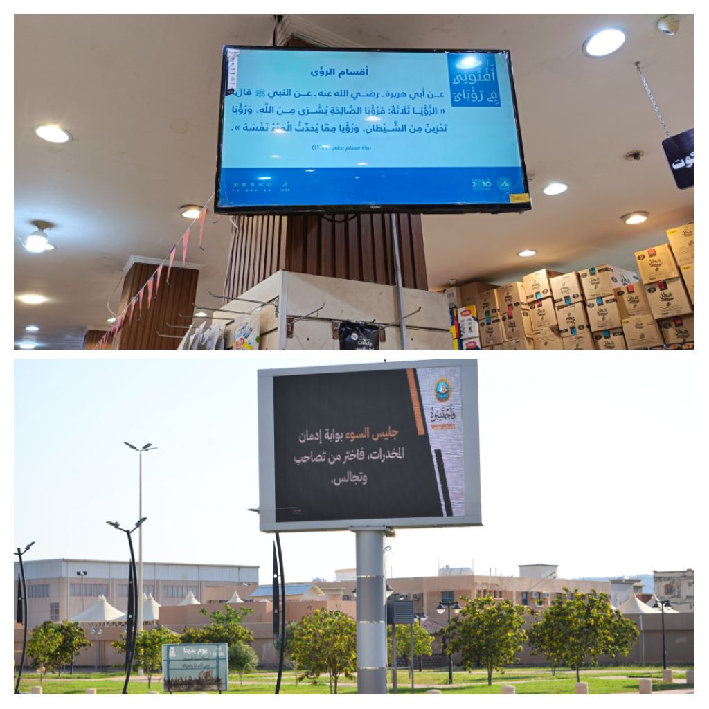 فعل فرع الرئاسة العامة لهيئة الأمر بالمعروف والنهي عن المنكر بمنطقة الباحة البرامج التوعوية والوقائية بمحافظتي الحجرة وقلوة، وذلك من خلال الشاشات الرقمية في الأماكن العامة