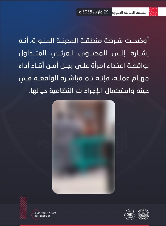 أوضحت شرطة منطقة المدينة المنورة أنها باشرت حادثة اعتداء تعرض لها أحد رجال الأمن أثناء تأدية مهامه، وذلك بعد تداول محتوى مرئي يوثق الواقعة.