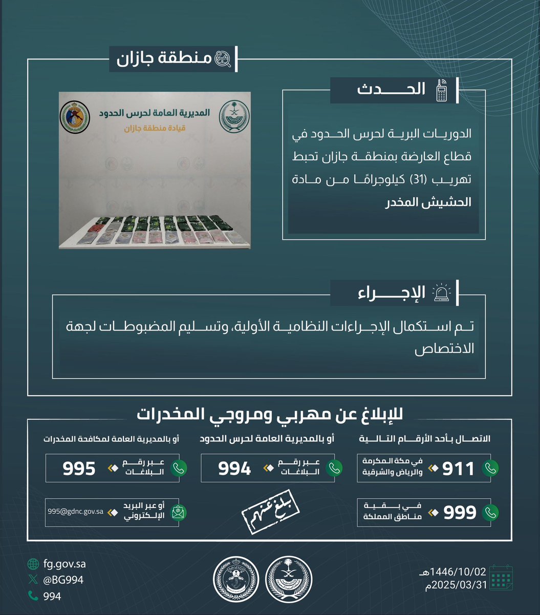 إذ تمكنت الدوريات البرية لحرس الحدود في قطاع العارض بمنطقة جازان من القبض على مهربين مخالفين لنظام أمن الحدود، حيث كانوا يحاولون تهريب 31 كيلوجرامًا من مادة الحشيش المخدر. وقد تم استكمال الإجراءات النظامية الأولية بحقهم، وتم تسليمهم مع المضبوطات إلى الجهة المختصة.