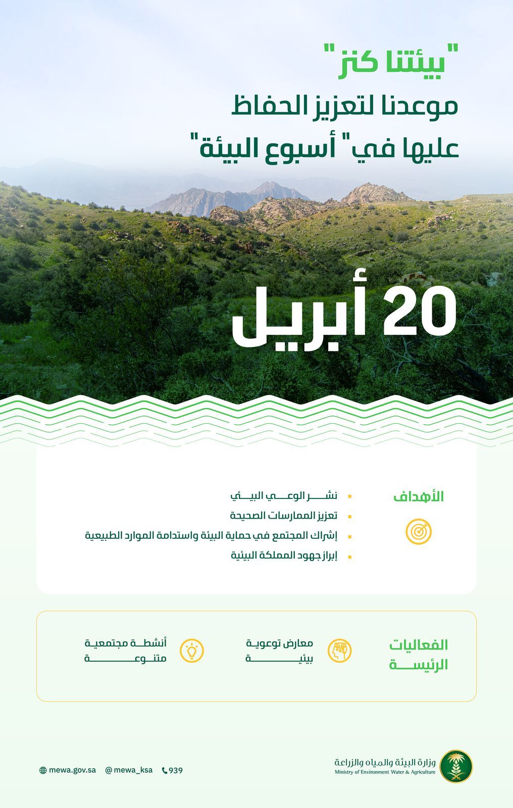 أطلقت وزارة البيئة والمياه والزراعة، بمشاركة واسعة من القطاع العام، والقطاع الخاص، والقطاع غير الربحي، والأفراد ؛ فعاليات أسبوع البيئة السعودي 2025 تحت شعار “بيئتنا كنز”، وذلك في 20 أبريل الجاري، والذي يأتي تأكيدًا لالتزام المملكة بالمحافظة على البيئة والموارد الطبيعية، وتعزيز جهودها وريادتها في هذا المجال؛ حيث أطلقت العديد من المبادرات البيئية المهمة، من أبرزها مبادرة “السعودية الخضراء”.
