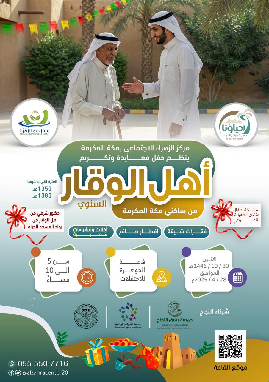 يعتزم مركز حي الزهراء الاجتماعي بمكة المكرمة بإقامة معايدة وتكريم لأهل الوقار من ساكني مكة المكرمة مساء يوم غداُ الأثنين ١٠/٣٠هـ بالتعاون مع شركاء النجاح.