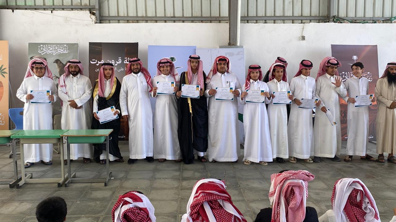 بحضور مدير المدرسة الأستاذ عبدالله بن سعيد آل خرصان الشهراني ووكلاء المدرسة الاستاذ مشبب عبدالله الشهراني والأستاذ تركي عبدالرحمن العلياني والموجه الطلابي بالمدرسة الأستاذ معدي حسين على ال حيه ورائد النشاط الطلابي الأستاذ محمد جابر الفيفي واعضاء هيئة التدريس بالمدرسة ومجموعة من أولياء أمور الطلاب.