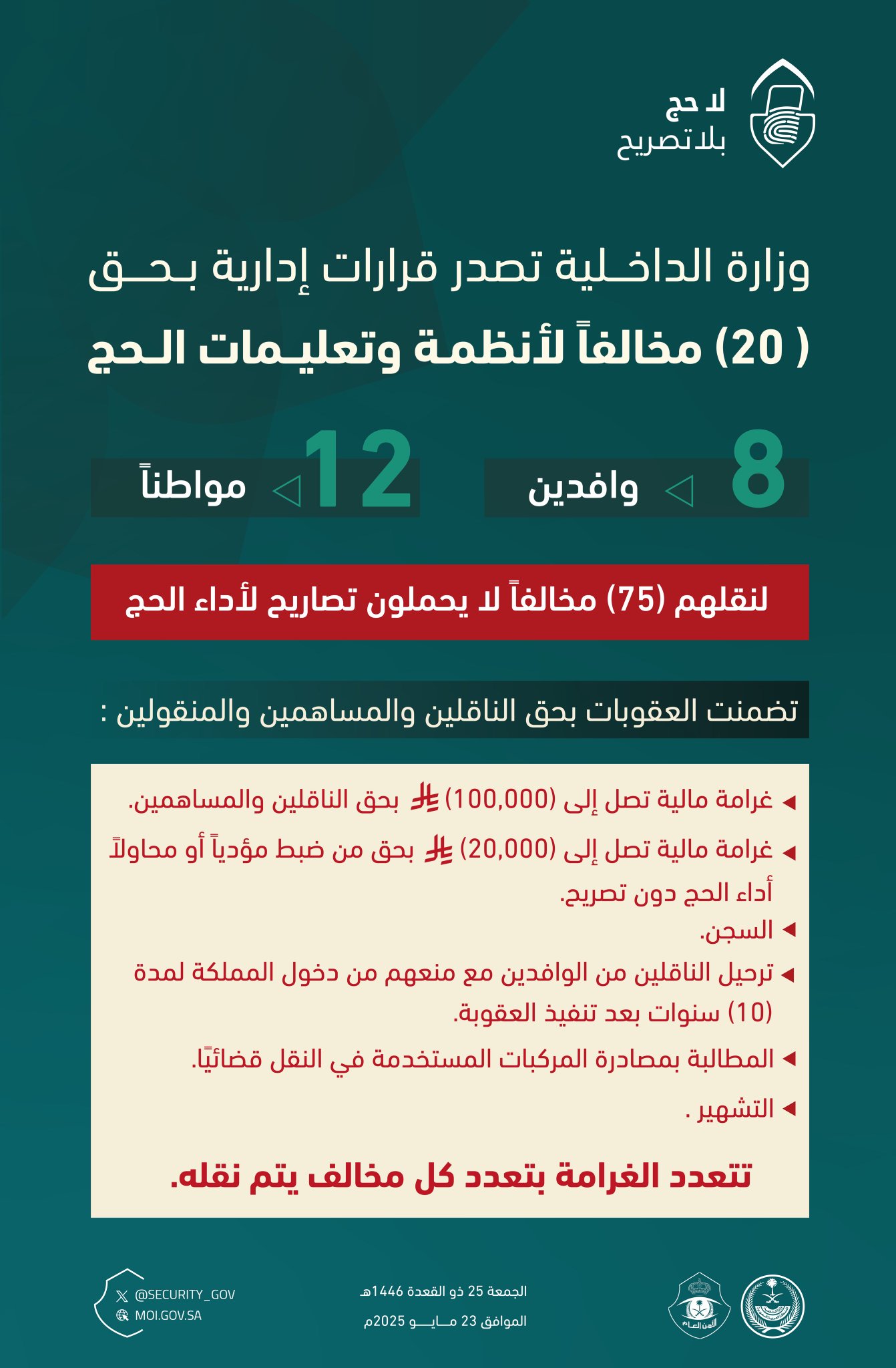 كما تم المطالبة بمصادرة المركبات المستخدمة في النقل قضائيًا، ومعاقبة من حاول أداء الحج دون تصريح بغرامة مالية تصل إلى (20,000) ريال.