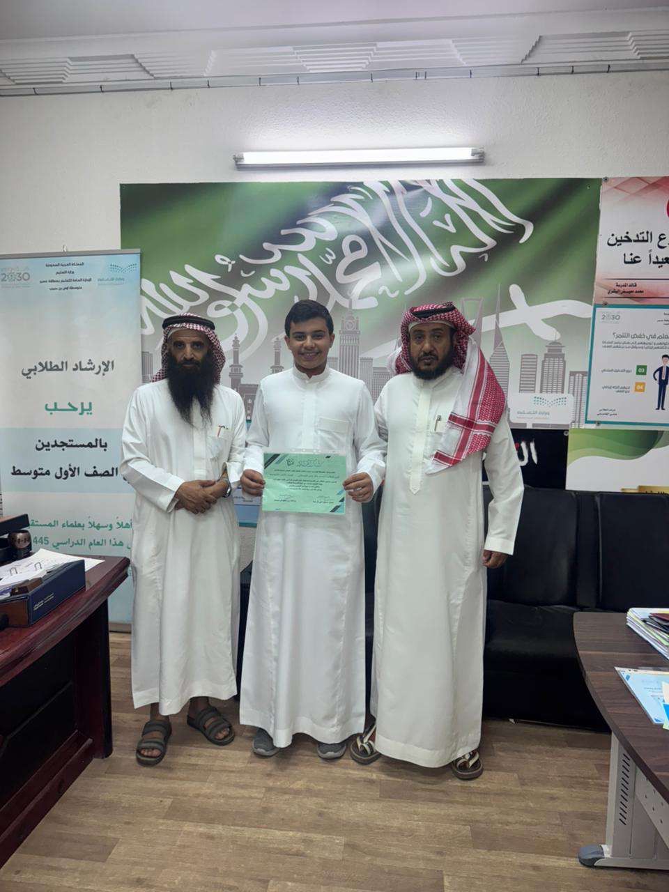 حيث حضر برنامج التكريم الاستاذ مشبب عبدالله الشهراني وكيل المدرسة والأستاذ تركي عبدالرحمن العلياني والموجه الطلابي بالمدرسة الأستاذ معدي حسين على ال حيه.