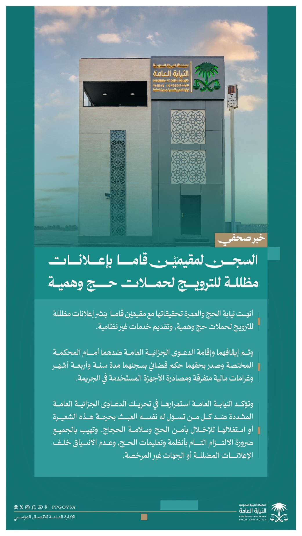 وتؤكد النيابة العامة استمرارها في تحريك الدعاوى الجزائية العامة المشددة ضد كل من تسوّل له نفسه العبث بحرمة هذه الشعيرة أو استغلالها للإخلال بأمن الحج وسلامة الحجاج.