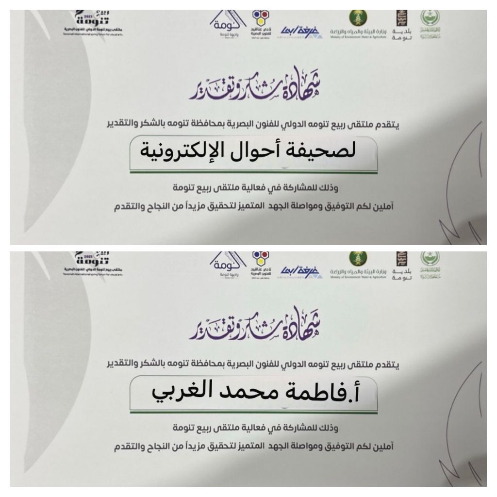 تم تكريم صحيفة أحوال الإعلامية تقديرًا لدورها البارز في تغطية فعاليات ملتقى ربيع تنومة الدولي للفنون البصرية بمحافظة تنومة بشكل مميز.