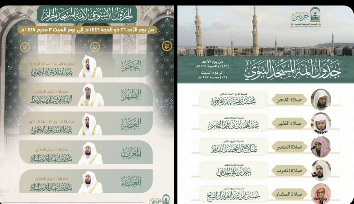 أوضحت رئاسة الشؤون الدينية بالمسجد الحرام والمسجد النبوي عن جدول الأئمة المكلفين بإمامة الصلوات للفترة من 26 ذي الحجة إلى 3 محرم 1447هـ، وذلك في إطار تنظيم الإمامة وتوفير أجواء روحانية تامة للمصلين والزوار.