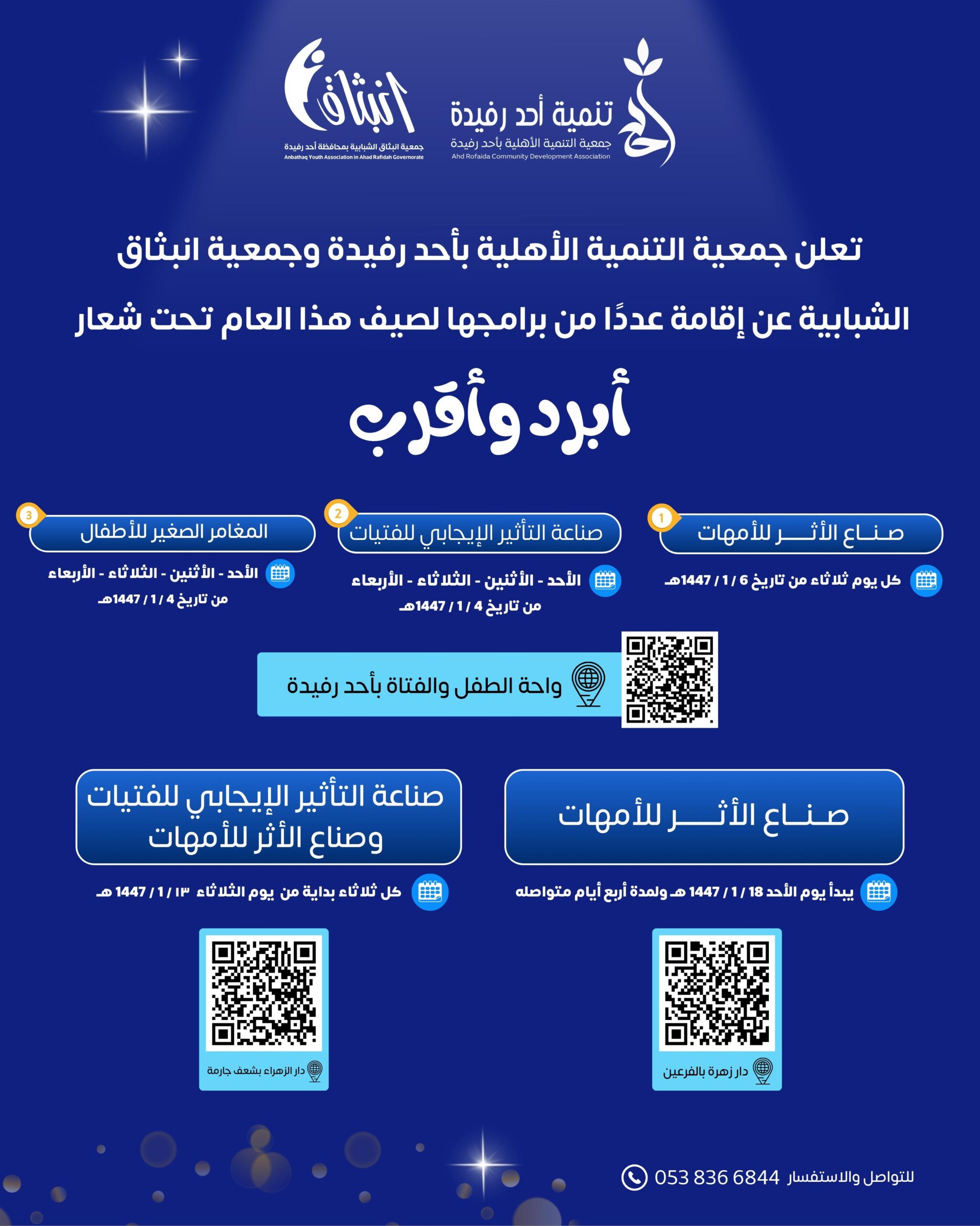 أعلن الأستاذ محمد بن علي بن درع آل وعلة عن إقامة برنامج الصيف ١٤٤٧ للهجرة حيث شملت البرنامج أكثر من (٢٠) برنامج تحت مسمى
