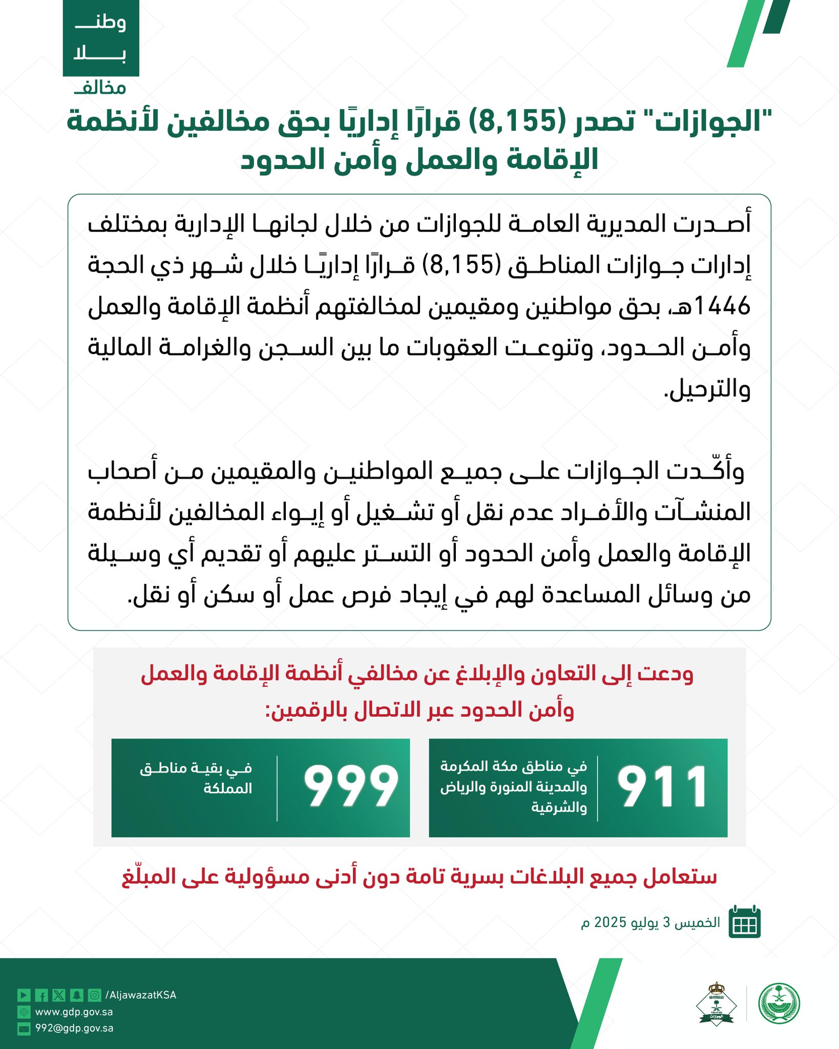 كما دعت المديرية العامة للجوازات المواطنين والمقيمين إلى ضرورة الامتثال للأنظمة واللوائح، والتعاون بالإبلاغ عن المخالفين لنظام الإقامة والعمل وأمن الحدود، من خلال الاتصال على الرقم (911) في مناطق مكة المكرمة والرياض والمنطقة الشرقية، أو على الرقم (999) في بقية مناطق المملكة.