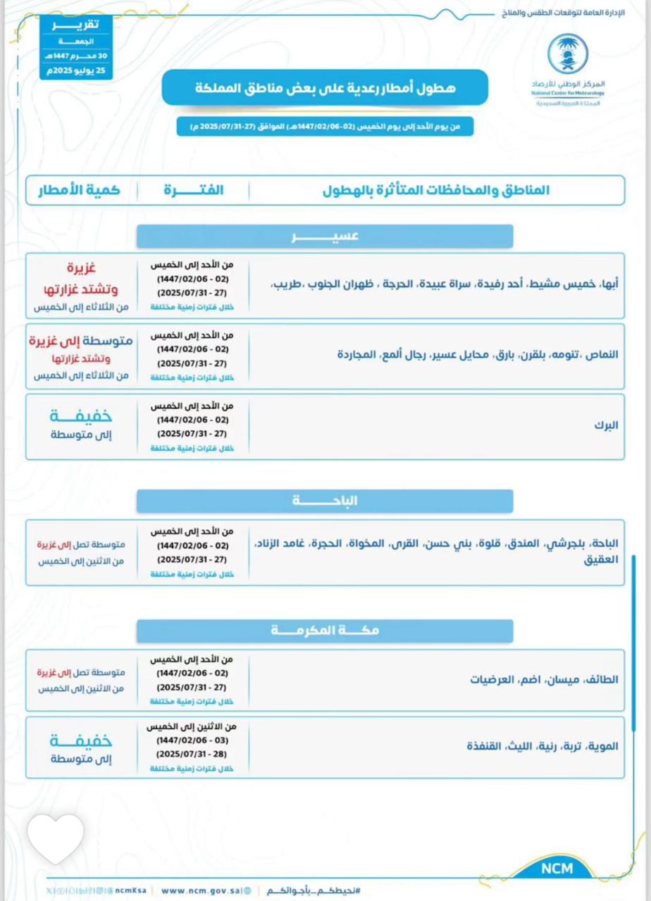 • العاصمة المقدسة والجموم: متوقع هطول أمطار خفيفة إلى متوسطة يوم الخميس 6 صفر 1447هـ الموافق 31 يوليو 2025م