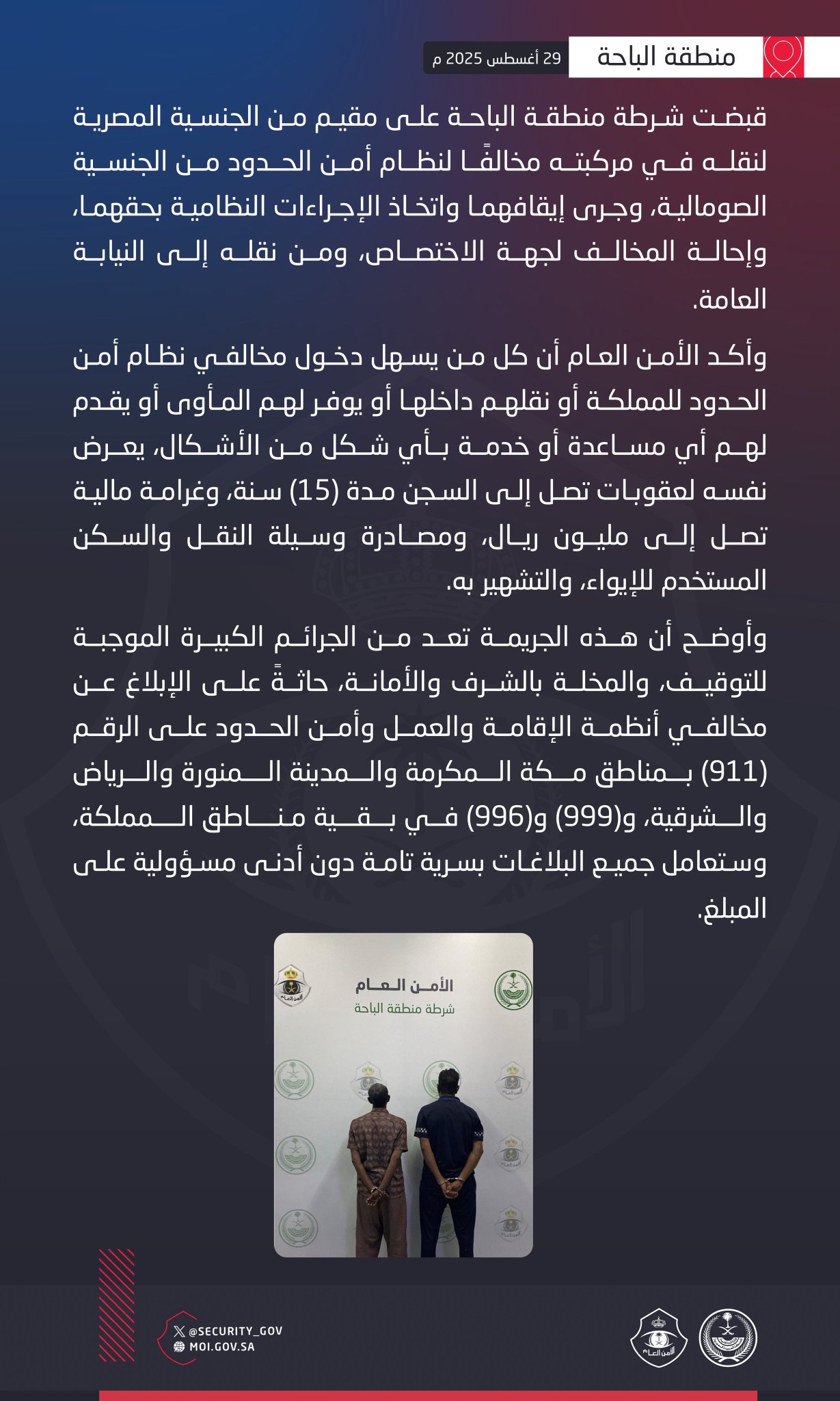 ودعا الأمن العام جميع المواطنين والمقيمين إلى التعاون والإبلاغ عن أي مخالفات لأنظمة الإقامة والعمل وأمن الحدود، وذلك عبر الاتصال على الرقم (911) في مناطق مكة المكرمة والمدينة المنورة والرياض والمنطقة الشرقية، وعلى الرقمين (999) و**(996)** في بقية مناطق المملكة، مشيراً إلى أن جميع البلاغات ستُعامل بسرية تامة ودون أي مسؤولية على المبلّغ.