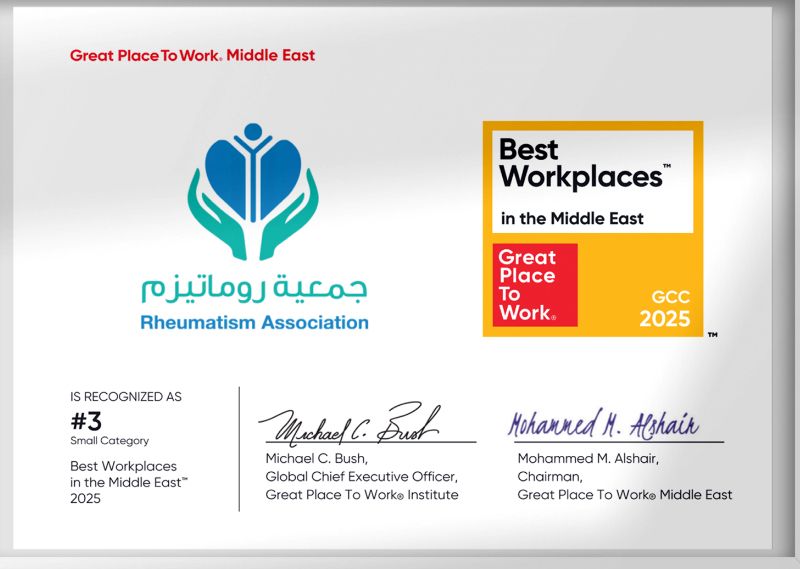 في تميّز جديد يضاف إلى سجل إنجازاتها حصلت الجمعية الخيرية لرعاية مرضى الروماتيزم على المركز الثالث كأفضل بيئة عمل في الشرق الأوسط لعام 2025م من بين 50 جهة مشاركة وفقاً لتصنيف الهيئة العالمية لثقافة بيئة العمل الدولية (Great Place To Work)، تقديراً للجهــود المشتركــة بين مجلس الإدارة والإدارة التنفيذية وفريق عمل الجمعية، والثقـافة المؤسسيـة لبيئة العمل الإيجابية الملهمـة التي تسهم في تقديم أعلى المعايير لخدمة المستفيدين والمجتمع، وثقافتها المؤسسية المتميّزة التي تقوم على أسس الثقة، والاحترام، والتعاون المتبادل فيما بينا أفراد فريق العمل.