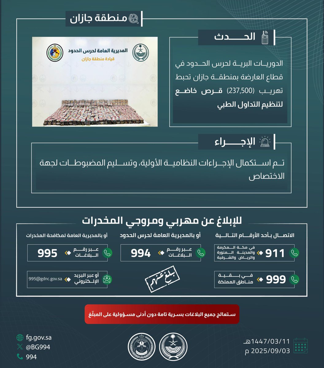 أحبطت الدوريات البرية لقطاع العارضة عملية تهريب (237,500) قرص خاضع لتنظيم التداول الطبي، حيث جرى استكمال الإجراءات النظامية الأولية، وتسليم المضبوطات للجهات المختصة.